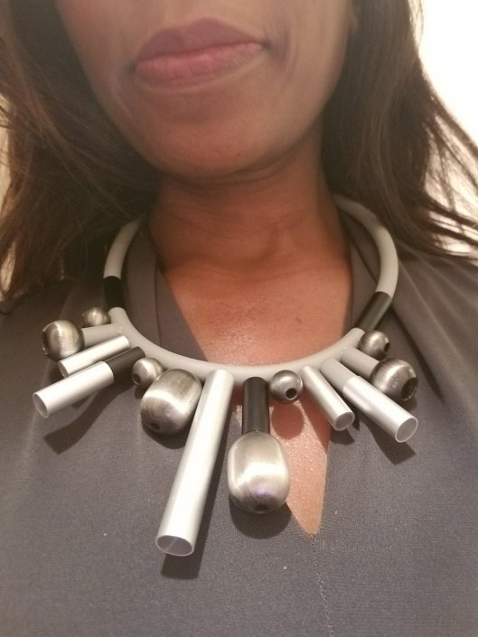 I know how important accessorizing can be. It can really make an outfit. After watching the movie Black Panther, I was impressed with the accessories just as much as the film. The necklaces were bold, large and architectually sculpted. I could take a little dress dress and Wakanda it. And, this can be done without looking like a costume. See below the fabulous necklaces I recently bought from one of my favorite designer discount stores, Fox’s.